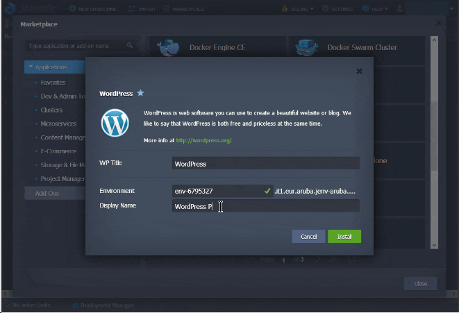 Uno dei punti di forza di Jelastic Cloud è sicuramente il suo marketplace da cui è possibile prelevare più di 50 applicazioni già ottimizzate e preconfigurate tutte installabili con un singolo clic tramite widget, un’unica piattaforma accessibile dalla dashboard del servizio consente di gestire progetti diversi sfruttando tecnologie differenti.