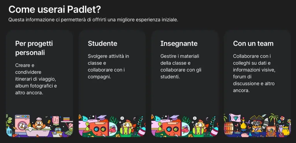 In pochi istanti l’account verrร creato. Allo step successivo vi verrร chiesto di indicare per quale finalitร vi state iscrivendo a Padlet: