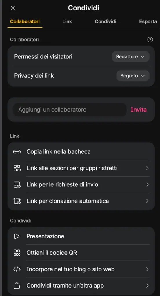 - Link per clonazione automatica: permette ad altri utenti di duplicare la bacheca con i contenuti originali.