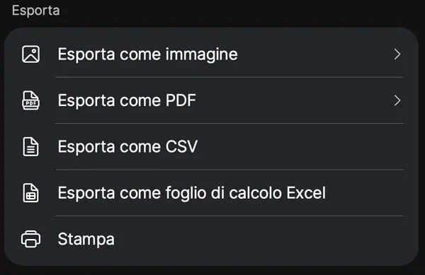 - Esporta come foglio di calcolo Excel – questa funzione esporta la bacheca direttamente in un file Microsoft Excel (.xlsx), organizzando i dati in righe e colonne.