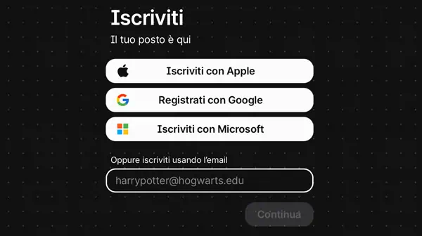 La creazione di un account รจ veloce: puoi registrarti utilizzando un indirizzo email oppure accedere tramite Google, Apple o Microsoft.