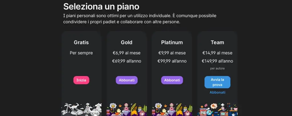 Padlet รจ un servizio a pagamento. Puรฒ essere provato gratuitamente, senza carta di credito, con funzioni limitate. vediamo di seguito i piani ed i prezzi nel momento in cui scriviamo: