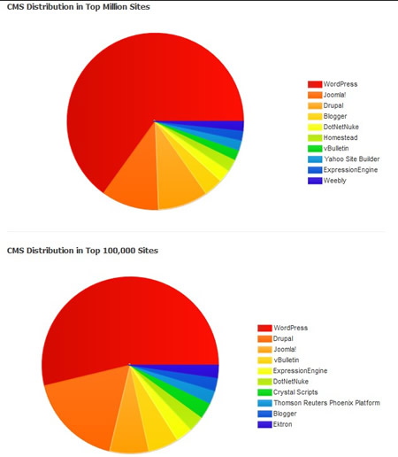 se si prende in considerazione il primo milione di siti nel mondo, per ordine di importanza, WordPress ne gestisce il 63%, seguito da Joomla! (11%) e da Drupal (9%).Restringendo la gamma ai primi 100 mila siti, Worpress domina un po’meno (53%) e il secondo posto è occupato da Drupal (17%), perché Joomla(7%) si adatta poco ai siti più complessi. Tra i primi 10 mila, Drupal èancora più presente (22%), mentre occupa un posto molto importante anche ExpressionEngine, un prodotto commerciale scritto in PHP e basato su database MySQL.