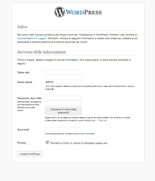 I dati nome utente, password e email sono i dati di accesso dell’account amministratore che verrà creato insieme al sito stesso. Questo utente è molto importante in quanto è quello abilitato inizialmente a gestire il sito: potrà effettuare qualsiasi modifica sul sito, creare eliminare o modificare articolo e potrà creare altri utenti.