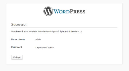 Se la procedura di installazione è terminata correttamente viene visualizzato nell’ultima schermata il pulsante Collegati che ci rimanda direttamente alla pagina di login del sito che ci porterà al backend del nostro nuovo blog.