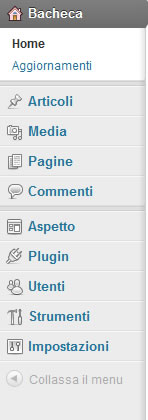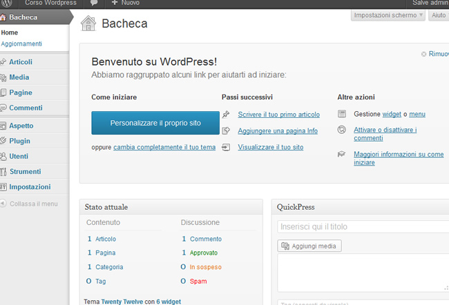 Effettuato il login si arriva ad una pagina ricca di elementi: la Dashboard. Si tratta, in pratica, del pannello di controllo di WordPress attraverso il quale è possibile aggiungere i contenuti e gestire ogni aspetto della configurazione del nostro sito.