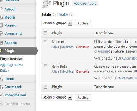 al cui interno è presente l’elenco di tutti i plugin presenti all’interno della nostra installazione di WordPress, sia quelli attivi, che quelli non attivi.