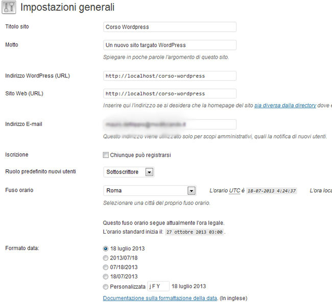 Questa voce riguarda appunto una serie di impostazioni del nostro sito divisi per categorie. Alcune delle impostazioni fanno parte delle informazioni iniziali che abbiamo inserito durante l’installazione e che ora possono essere modificate. Altre riguardano specifici aspetti del blog.