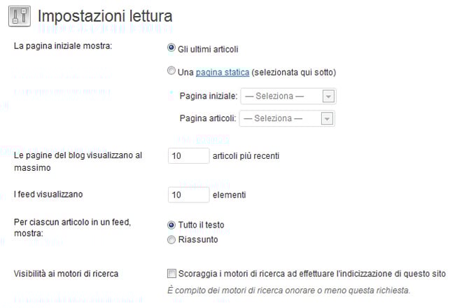 Viene specificato ad esempio, cosa comparirà sulla home page: una pagina statica oppure un elenco con gli ultimi articoli inseriti.
