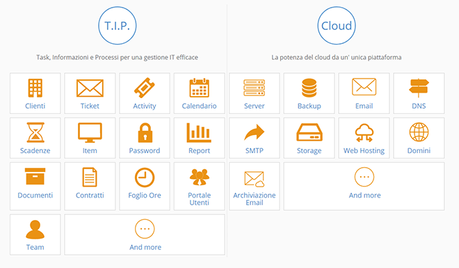 Grazie ad un’unica piattaforma integrata, infatti, è possibile gestire, nel giro di pochi click, Server, Backup, Posta Elettronica, Archiviazione Email, Account SMTP, Storage e tanti altri servizi indispensabili per chi opera nell’IT. Con Sygma, inoltre, si possono amministrare T.I.P (Task, Informazioni e Processi) per una gestione IT efficace e completa: non soltanto le scadenze, ma anche il portafoglio clienti, i ticket, le attività, i calendari lavorativi, la documentazione, i contratti, report, le password e i team saranno sempre sotto controllo al fine di massimizzare la produttività del tuo business.
