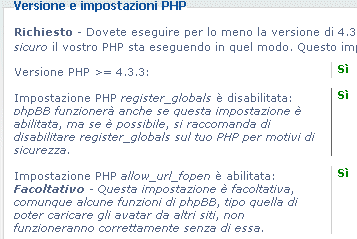 - direttiva “allow_url_fopen” abilitata: si tratta di un’impostazione facoltativa, ma alcune funzioni di phpBB, come per esempio il caricamento degli avatar da url esterne, non funzioneranno in modo corretto se essa รจ disabilitata;