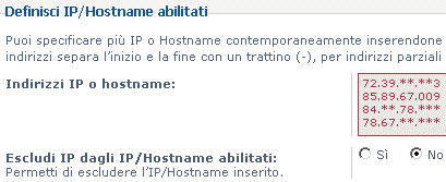 - Indirizzo IP: verrร escluso dalla partecipazione chiunque si colleghi tramite un determinato IP, anche in questo caso รจ possibile indicare piรน di un IP o nome server inserendone uno per ogni riga; se si desidera indicare un intervallo di indirizzi IP sarร necessario separarne l’inizio e la fine tramite trattino (“-“) mentre per indicare un’abbreviazione bisognerร utilizzare l’asterisco “*”.