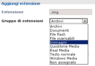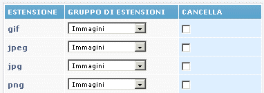 Nella lista, per ogni estensione verrร indicato il gruppo di appartenenza (che potrร essere modificato grazie all’apposito menu a tendina), la casella di spunta corrispondente alla colonna “Cancella” permetterร di rimuove una o piรน estensioni alla volta. Se si desidera aggiungere una nuova estensione, รจ disponibile un piccolo modulo grazie al quale sarร possibile scriverne il nome e definire il gruppo di appartenenza.