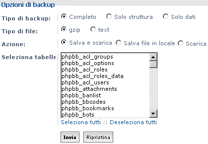Attraverso il backup sarร possibile creare backup anche soltanto di singole tabelle, comprimere le copie di sicurezza in formato Gzip e decidere se salvare il backup nella cartella “store/” di PhpBB” o scegliere di scaricarlo sul disco locale.
