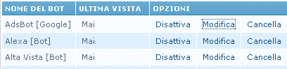 Qui sono poi disponibili gli strumenti per la gestione di “bots”, “spiders” e “crawlers”, cioรจ dei veri e propri “utenti automatizzati” utilizzati dai motori di ricerca per l’aggiornamento dei propri database; di rado essi fanno un uso corretto delle sessioni e possono alterare il valore del contatore delle visite, quindi ognuno di essi potrร essere anche disattivato; in alternativa รจ possibile cancellare le voci che non interessano o modificarne le relative informazioni nel caso di aggiornamenti.