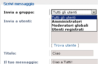 Se non si desidera inviare un messaggio ad un intero gruppo, รจ possibile elencare i destinatari nella apposita textarea in corrispondenza della voce “Invia a utenti”, ma specificare dei Nomi utente in questo campo annullerร qualsiasi gruppo selezionato precedentemente. E’ possibile scrivere soltanto del testo normale (niente HTML o BBCode), tutto il resto verrร rimosso prima dell’invio. Per ogni messaggio potrร essere indicato il livello di prioritร scegliendo tra “Alta”, “Bassa” e “Normale”, inoltre sarร possibile scegliere se inviare l’email immediatamente (opzione “Invia adesso”) o se porre il messaggio in attesa di essere spedito.