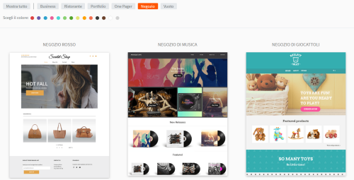 Per chi volesse operare una scelta a partire da un criterio di classificazione preciso sono appunto disponibili le categorie "Business", "Ristorante", "Portfolio", "On Pager", "Negozio" e "Vuoto". Nel caso del nostro esempio abbiamo selezionato la categoria "Negozio" in modo da visualizzare i template più adatti per uno store.