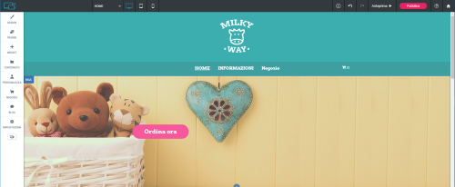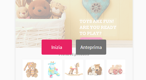 Una volta scelto il template, per proseguire nella realizzazione dello store bisogna cliccare sul pulsante "Inizia", che porta alla sezione "Crea il tuo sito" dove è presente l’editor per la personalizzazione.