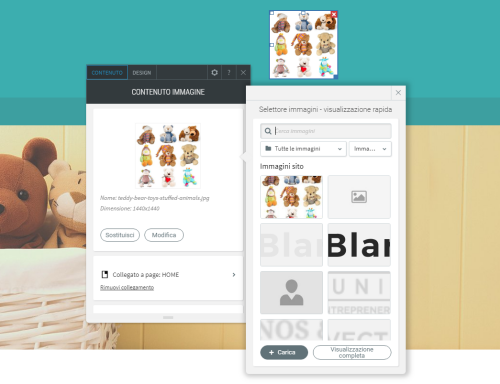 "Contenuto immagine" è disponibile per qualunque immagine si desideri pubblicare, non soltanto per il logo, e attraverso di esso (scheda "Contenuto") si può accedere ad ulteriori strumenti con cui, per esempio, associare l’immagine ad un link (verso una pagina esistente, una risorsa esterna, un email, un ancoraggio..). La scheda "Design" consente invece di definire il layout di un immagine, come per esempio la sua larghezza, l’ombreggiatura e lo stile dei bordi, o di agire sulla spaziatura interna. Alcune modifiche saranno disponibili soltanto per determinati device, ad esempio soltanto per Desktop e tablet.