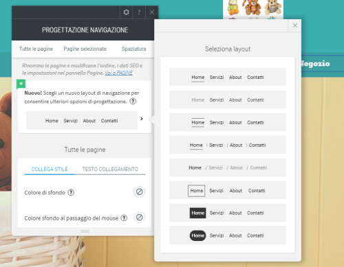 Cliccando sullo spazio che contiene il menu predefinito del template scelto per il proprio e-commerce è possibile accedere allo strumento "Progetto navigazione". Quest’ultimo permette di modificare il layout di navigazione di default scegliendo da una serie di stili che si differenziano sia per l’impostazione (tipo)grafica che per gli effetti associati ai link.