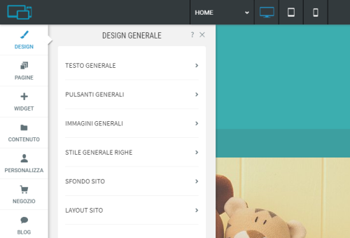 Lo strumento "Design generale" consente di operare delle modifiche che agiscono a livello globale sul sito Web, questo significa che se per esempio lo si utilizza per selezionare un font specifico per il testo, questa scelta influirà su tutte le pagine pubblicate.