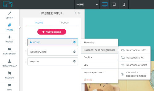 Qualsiasi pagina può essere rinominata, duplicata, protetta da password ed eventualmente nascosta per tutti i dispositivi o soltanto ai navigatori che utilizzano determinati device.