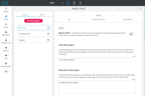Particolarmente interessanti le funzionalità per la SEO (Search Engine Optimization) con cui impostare il titolo di una pagina, scrivere la descrizione del sito Internet e definire le parole chiave con cui essere trovati tramite i motori di ricerca. Chi lo desiderasse potrebbe anche decidere di escludere una specifica pagina dall’indice in modo che non sia visibile tra i risultati di Google e piattaforme analoghe.