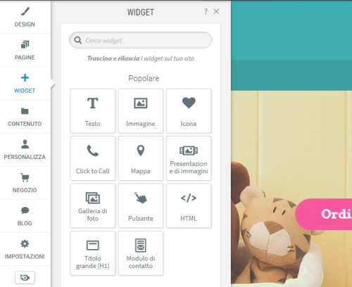 Un widget è una funzionalità aggiuntiva integrabile nel proprio sito Web. Simply Shop consente di fare ciò con una semplice operazione di trascinamento: si clicca sulla voce di menu "Widget" e divengono disponibili una serie di feature, dai semplici box di testo ai blocchi di codice HTML, dai form di contatti ai pulsanti, dalle gallerie fotografiche alle presentazioni fino ai pulsanti di chiamata.