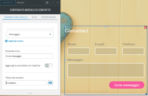 Una volta scelto il widget desiderato, per includerlo in una pagina basta trascinarlo nel punto in cui lo si vuole posizionare, fatto questo si aprirà una nuova finestra che consente di personalizzare il nuovo elemento. L’immagine seguente mostra l’esito dell’integrazione di modulo per i contatti con a fianco la finestra contenente gli strumenti per la sua modifica.