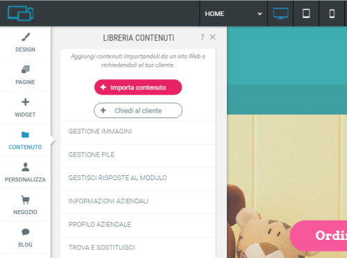 Cliccando sulla voce "Contenuto" della sidebar si accede allo strumento "Libreria contenuti". Quest’ultima consente di archiviare dati, file e immagini da (ri)utilizzare per un sito Web in modo che risultino rapidamente accessibili. I contenuti memorizzati non devono essere necessariamente locali, ma possono essere importarti da una risorsa esterna indicando al servizio il loro URL.