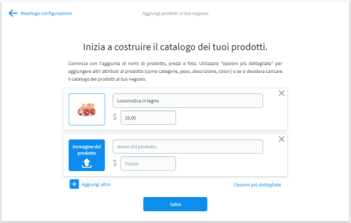 L’interfaccia propone inizialmente una scheda semplificata, con la quale è sufficiente indicare nome e prezzo del prodotto, potendo caricare inoltre un’immagine descrittiva. Il link "Aggiungi altro" consente poi di inserire un ulteriore prodotto in catalogo rimanendo nella stessa pagina.