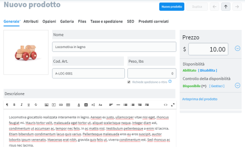 La stessa schermata consente di gestire alcuni aspetti avanzati come quelli che riguardano il magazzino, indicando per esempio se il prodotto è attualmente disponile e può essere quindi abilitato per la vendita. Si possono poi associare al prodotto attributi come l’UPC (Universal Product Code), cioè il codice univoco standard dell’oggetto in vendita, e indicare l’eventuale brand (marchio) di appartenenza.