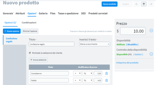 Interessante la possibilità di definire delle opzioni con conseguente variazione di prezzo, tali opzioni possono essere inoltre combinate in modo da garantire al cliente maggiori opportunità di scelta. Nell’esempio raffigurato dall’immagine seguente abbiamo previsto due opzioni ("Compleanno" e "Natale") in grado di modificare il costo del prodotto a seconda della confezione regalo scelta.