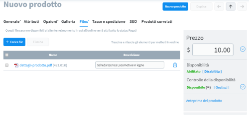 Per rendere ancora più accattivante la scheda prodotto è poi possibile creare una galleria fotografica, vi è inoltre il tab "Files" con cui uploadare un eventuale documento scaricabile da chi è interessato a consultare, ad esempio, le specifiche dettagliate riguardanti il prodotto.