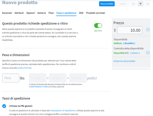 La tab "Tasse e spedizione" consente di definire le imposte che dovranno essere applicate sul prodotto e le modalità con cui esso dove essere inviato al cliente. Chiaramente non tutti i prodotti vendibili sono "fisici", uno store potrebbe commercializzare per esempio del software e avere l’esigenza di disabilitare le opzioni relative alle spedizioni, motivo per il quale l’interfaccia prevede anche questa possibilità. In tutti gli altri casi il sistema consente di variare il costo delle spedizioni a seconda del peso, prevede la possibilità di impostare la spedizione gratuita per alcuni prodotti o di definire una tariffa fissa (anche in caso di vendita a livello globale) per l’invio degli oggetti in vendita ai destinatari.