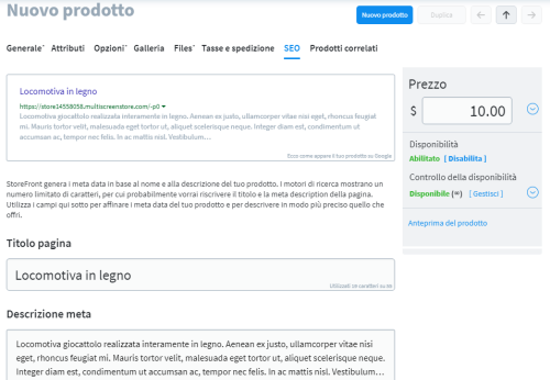 La tab "SEO" (Search Engine Optimization) permette di agire su alcune informazioni come per esempio il titolo e la descrizione di un prodotto per aumentare le opportunità che esso conquisti un buon posizionamento tra i risultati dei motori di ricerca. Il sistema verificherà anche la lunghezza dei testi, tenendo conto del numero dei caratteri presi in considerazione dai motori di ricerca per l’indicizzazione di tali contenuti.