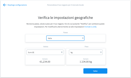 Il collegamento per la "Verifica delle impostazioni geografiche" del menu laterale consente di settare alcune informazioni relative alla localizzazione del negozio. Si può quindi indicare al sistema il Paese dal quale si opera, la valuta di riferimento per i pagamenti (nel nostro caso l’Euro) e l’unità di misura da impiegare per calcolare il peso dei prodotti spediti (Kg).