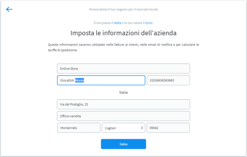 Fatto questo si possono impostare le informazioni relative all’azienda titolare dell’e-commerce. I dati richiesti sono i consueti, tra cui la ragione sociale e i recapiti fisici e telefonici dell’attività.