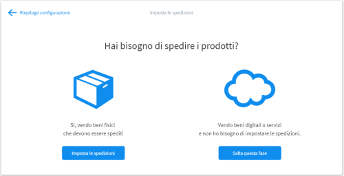 Le impostazioni di prelievo e spedizione riguardano tutti quei venditori che commerciano online prodotti fisici, quindi potranno essere ignorate nel caso in cui si vendano esclusivamente dei beni immateriali (come per esempio delle applicazioni o degli e-book) o si forniscano dei servizi. Tutti coloro che vendono invece dei prodotti materiali, fisici, possono procedere cliccando su "Imposta la spedizione".