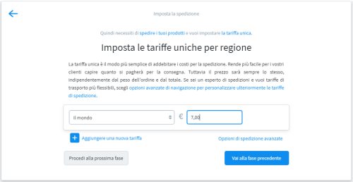 I settaggi di questa fase permettono innanzitutto di definire delle tariffe uniche per regione. Si tratta di opzioni particolarmente utili ai fini della vendita perché consentono di specificare dei prezzi di spedizione che saranno sempre gli stessi indipendentemente dal peso dell’ordine o dal numero di prodotti ordinati. E’ possibile definire una tariffa unica valida a livello globale, così come per alcune macroregioni come per esempio l’Europa, gli Stati Uniti o l’intero mercato nordamericano.