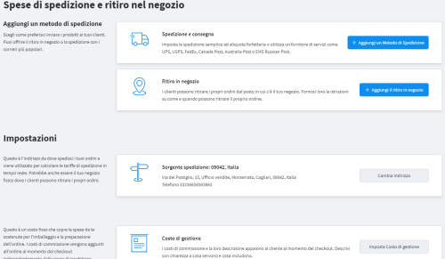 - Spedizione e consegna: consente di impostare la spedizione semplice sulla base di un’aliquota forfettaria o di fare riferimento ad un fornitore di servizi (UPS, FedEx..).