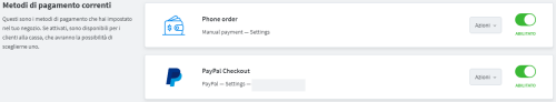 Una volta abilitato PayPal esso comparirà tra in metodi di pagamento disponibili. Nel caso lo si desideri si possono sfruttare entrambe le opzioni di base del servizio, cioè l’ordine telefonico con pagamento manuale (in pratica senza transizioni online) e PayPal Checkout (quando abilitato), oppure attivare soltanto una di esse.
