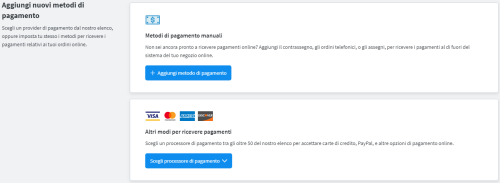 In ogni momento è possibile integrare ulteriori metodi di pagamento, sia offline (ad esempio tramite assegno o bonifico) che online tramite carta di credito o piattaforme per i pagamenti online. In questo secondo caso è possibile fare riferimento ad oltre una cinquantina di circuiti tra cui Visa, MasterCard, AMEX e Discover.