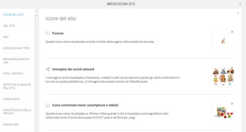 La sezione "Icone del sito" permette di caricare alcune immagini che incrementeranno la riconoscibilità del nostro progetto. Nello specifico è possibile impostare: