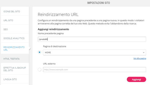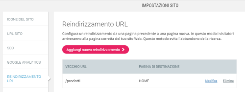 Una volta aggiunto un nuovo redirect viene proposta una lista di tutti i reindirizzamenti specificati che potranno essere eventualmente modificati o eliminati a seconda delle proprie esigenze.