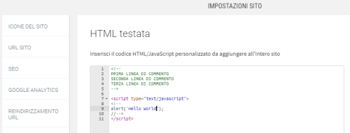 L’opzione "HTML testata" è dedicata in particolare a coloro che possiedono conoscenze anche minime in tema di sviluppo per il Web. A questo proposito il sistema mette a disposizione un Editor di codice, con supporto per la colorazione della sintassi, all’interno del quale si può digitare o incollare codice HTML e JavaScript che avrà effetto su tutte le pagine del sito Web.