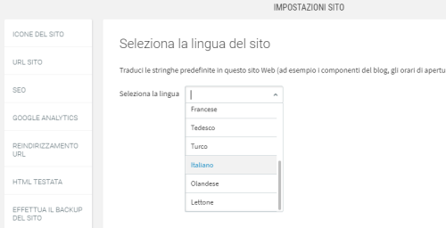 La piattaforma consente di specificare la lingua del nostro store. Sono disponibili diverse lingue tra cui quelle più utilizzate al Mondo (Inglese, Spagnolo, Francese..) e alcuni idiomi meno diffusi come per esempio il Lettone. Una volta selezionata la lingua desiderata è possibile tradurre le stringhe predefinite del sito, come le informazioni sugli orari di apertura o le pagine sul trattamento dei cookie e dei dati personali (vedremo a breve le funzionalità dedicate a questi ultimi due aspetti).
