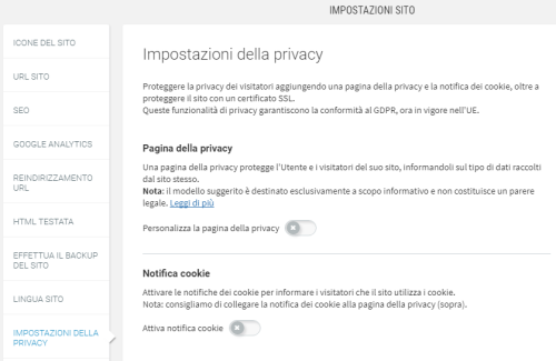 Viviamo in tempi di Cookie Law e GDPR (General Data Protection Regulation), quindi Simply Shop non poteva non offrire degli strumenti appositi. Questi ultimi possono essere raggiunti cliccando sul collegamento "Impostazioni della privacy", fatto questo sarà possibile abilitare e personalizzare sia la "Pagina della privacy", cioè il documento in cui specificare come vengono trattati i dati degli utenti rispettando le normative vigenti in materia, che la "Notifica cookie" (preferibilmente da collegare all’informativa sulla privacy) con cui rendere note agli utenti le tipologie di cookie (tecnici, di profilazione..) utilizzati dal sito.