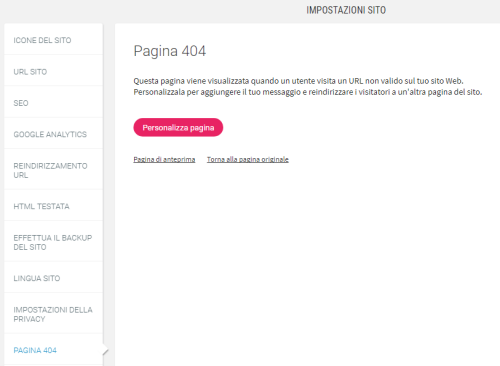 Per realizzare una Pagina 404, dopo aver cliccato sull’omonimo collegamento del menu laterale si deve fare lo stesso con il pulsante "Personalizza pagina".