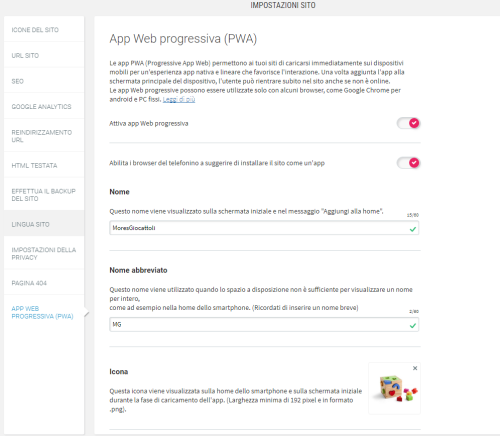 Tramite l’apposito collegamento posto alla fine del menu laterale, di una PWA si possono definire il nome visualizzabile nella schermata per l’aggiunta alla Home, una sua abbreviazione (utile per l’aggiunta nelle schermate), un’icona e il colore di sfondo che viene visualizzato durante la fase di caricamento del sito.